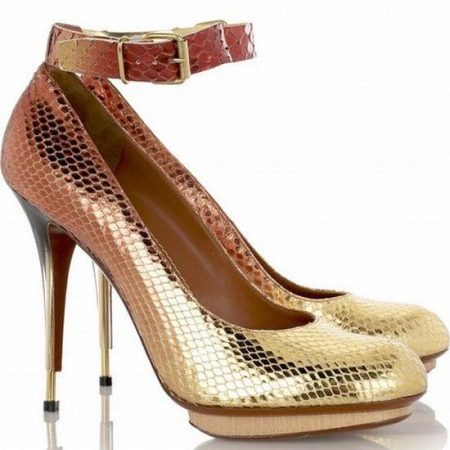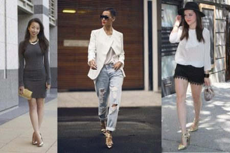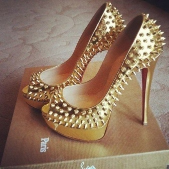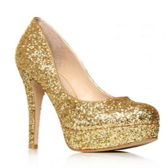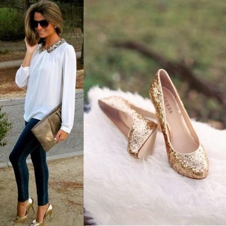 Kombinerede modeller ser usædvanlige ud: for eksempel kan kun en stiletthæl eller en tå være gylden. Nogle gange kan endda en tynd kant langs kanten og en iørefaldende metalspænde omdanne sko betydeligt.