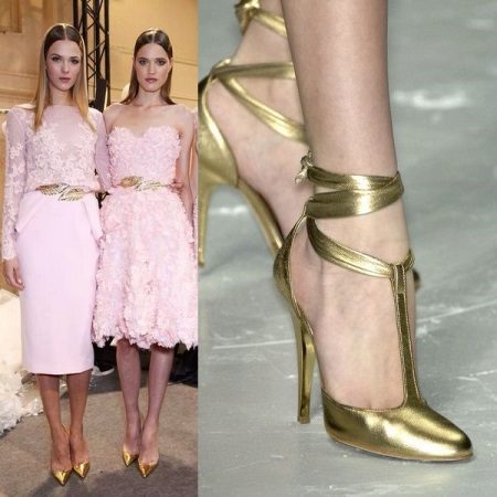 En ekstraordinær model af guldtøfler med slips vil være et passende supplement til en blød lyserød kjole.