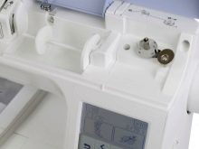 Maskinen er udstyret med et firspolet stativ og en spolevinder. Arbejd med gevind så automatiserede som muligt. En USB-port giver dig mulighed for at forbinde enheden til en computer og downloade nye designs. LED-markøren viser, hvor nålen går. Prisen for modellen er 279.000 rubler.