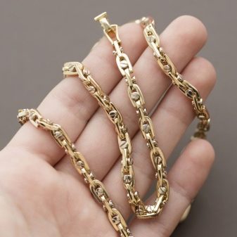 Gult guld, hvor dyre smykker er lavet, kan være 585 eller 750. Sammensætningen af en sådan legering inkluderer sølv og kobber, og sølv bør være fra 17 til 28 procent, afhængigt af prøven.