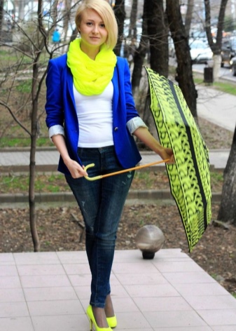 Det mest populære og saftige tilbehør er gul, turkis, rød, lilla og blå. Sådanne muligheder vil være den perfekte løsning for en dristig og selvsikker fashionista, der ikke er bange for at tiltrække andres opmærksomhed.