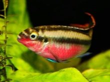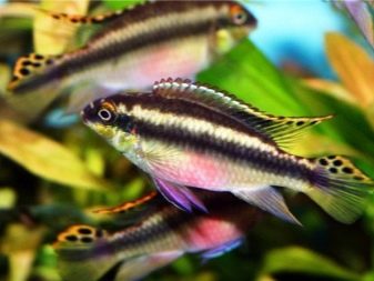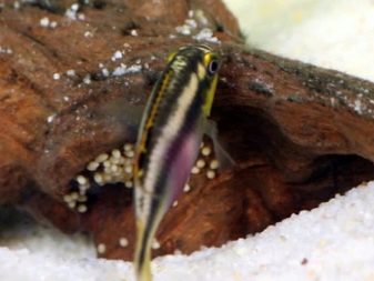 - Taeniatus - ein sehr unprätentiöses Aussehen mit einer vergrößerten Rücken- und Afterflosse. Vor dem Hintergrund der üblichen Grundfarbe sehen rosa Flossen spektakulär aus. Während des Laichens wird der Bauch der Weibchen rosa gesättigt.