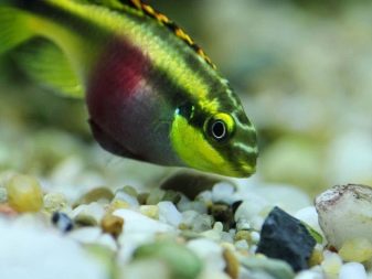 - Gelbbauch - eine schöne Aussicht, deren Männchen dunkle Streifen am beigen Körper und rote Fransen an den Flossen haben, aber die Weibchen haben einen purpurroten Ton und einen türkisfarbenen Kiementon. Diese Art kann bis zu 15 cm groß werden.
