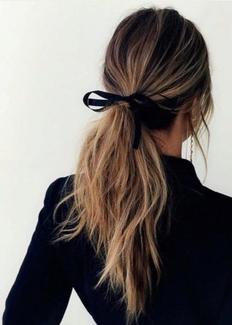Mit der Balayazh-Technik gefärbtes Haar sieht auch schön aus, wenn im Schwanz gesammelt. Gleichzeitig kann ein schräger oder gerader Knall das Bild auffrischen. Sie können eine solche Frisur mit einer schönen Bogenhaarspange dekorieren. Sie können im Schwanz als glattes Haar sammeln und vorgerollt.