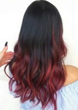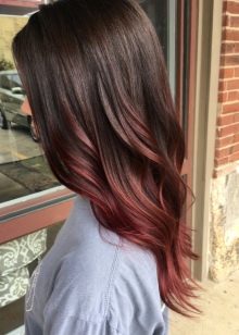 Liebhaber kühner Bögen sollten genauer hinsehen zu feurig rot oder rot - Sie erzeugen einen stilvollen Kontrast, und eine solche Färbung kann sowohl über die gesamte Länge als auch nur an den Spitzen durchgeführt werden. Um jedoch den natürlichsten Effekt zu erzielen, ist es besser, Töne zu bevorzugen. Tee-, Schokoladen- und KaffeeblumenEs sieht auch gut aus Wein, Bronze und Himbeere. Für Unterstützer mutiger Experimente sollten Sie wählen lila, rosa oder lila Töne.