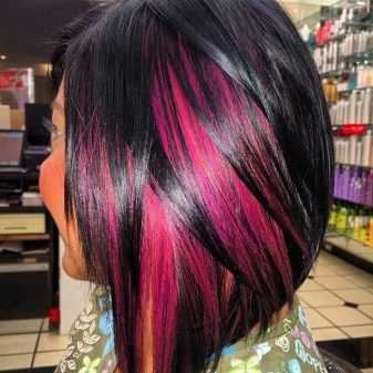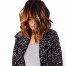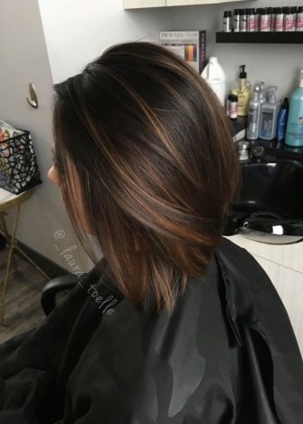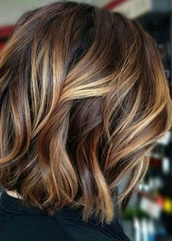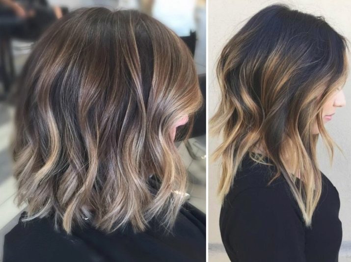 Damen mit dunklen Locken müssen zuerst die zu lackierenden Stränge aufhellen, um den maximalen Effekt zu erzielen. Da solche Mädchen hauptsächlich Herbst- und Winterfarbtypen zugeordnet werden, müssen in der ersten Version warme Farben verwendet werden: Karamell, Gold und Honig und in der zweiten Version kalte Farben: Silber, Platin und Aschfahl.