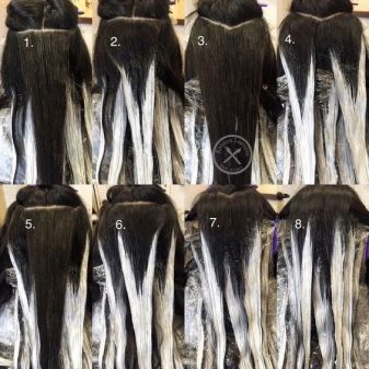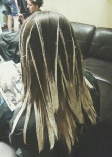 Um die Locken nicht zu beschädigen, wird empfohlen, eine Operation an einem schmutzigen Kopf durchzuführen. Alle Haare sind in sechs identische Zonen unterteilt: die Krone des Kopfes, zwei temporale, zwei parietale und okzipitale. Zur Vereinfachung ist jeder Strang mit einem bequemen Gummiband befestigt. Zunächst werden die Enden der Locken bearbeitet: Nach etwa einer halben Stunde Auftragen des Farbstoffs muss dieser gründlich abgewaschen werden.