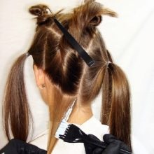 Zu Beginn sollten Sie die Stränge sorgfältig kämmen. Mit einer Stricknadel oder einer scharfen Spitze eines Pinsels mit Separator werden die Locken in 4-5 identische Zonen unterteilt. Jeder von ihnen sollte mit einem Gummiband zusammengebunden werden und eine Beule bilden, da sie sonst die Fleckenbildung beeinträchtigen.