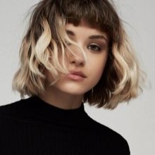 - Eine interessante Grundlage für die Arbeit wird sein Bob Balayazh verziert und modifiziert einen Haarschnitt. Ein spezieller Farbauftrag hilft, das obere Volumen zu vergrößern und die unteren Schlösser optisch zu verlängern. Durch Färben können Sie ein breites Kinn korrigieren, ein birnenförmiges Oval des Gesichts.