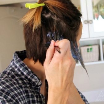 - Mittel Im Voraus werden mehrere Zonen für die Verarbeitung mit zusätzlicher Farbe identifiziert, z. B. der Hinterkopf, Pony, Spitzen und der Bereich der Schläfen. Jeder Strang wird mit glatten Übergängen übermalt.