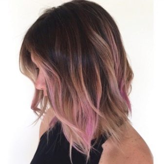 Die Färbung kann so erfolgen, dass das Bild verziert wird, bleibt jedoch schwer fassbar. Separate Blendung ist eine Alternative zu einer kompletten Hütte. Um zwischen natürlichen und hellen Farben zu wechseln, können Sie Pink verwenden. Eine solche Frisur wird sehr extravagant aussehen und die Aufmerksamkeit der Passanten auf ihren Besitzer lenken.