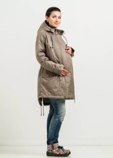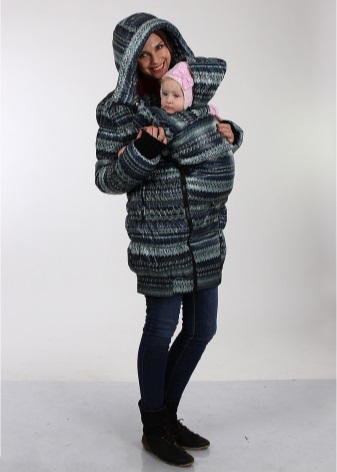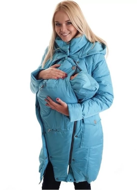 Es gibt auch spezielle Mutterschaftsschlingenparks mit speziellen Einsätzen zum Anpassen der Größe. Und für die Zeit nach der Geburt haben solche Jacken einen Babytragetucheinsatz.