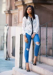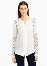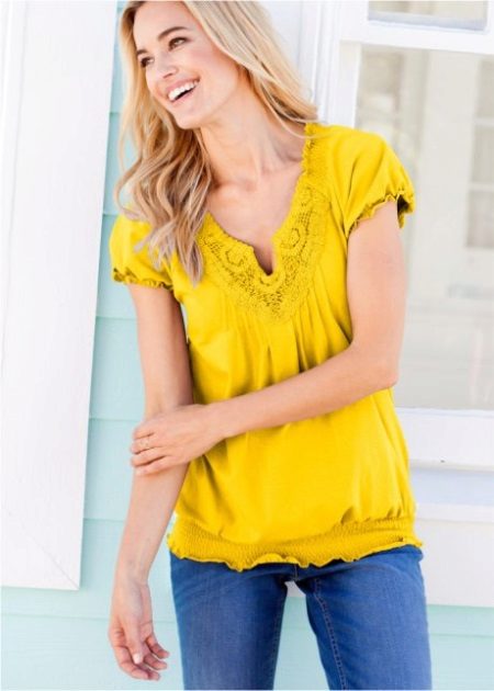 Genauso wie es keine Regeln ohne Ausnahmen gibt, finden sich unter den Blusen sehr originelle Exemplare aus Baumwolle, Wolle und sogar Mohair. Und ohne gestrickte Strickbluse ist keine einzige Sommergarderobe komplett. Interessante Optionen ergeben sich durch die Kombination verschiedener Materialien und Texturen, wie auf den Bildern auf dem Foto.