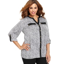 - Mit den leuchtenden Farben der Bluse können Sie die Aufmerksamkeit von übermäßig üppigen Hüften ablenken.