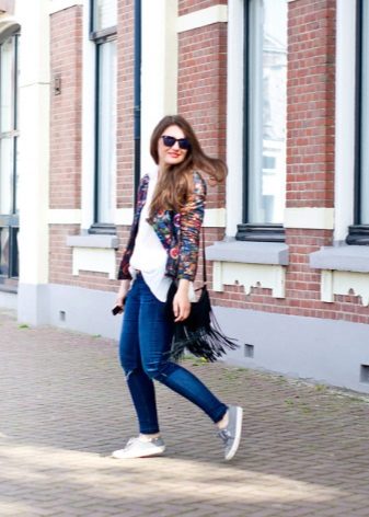 Schlichte Bluesons im lakonischen Stil bieten Platz für die Auswahl an Accessoires. Angesichts der Weiblichkeit dieses kleinen Dings als solches wird es jedoch nicht empfohlen, massiven Metallschmuck zu verwenden. Um die Betonung der Hüften zu verbessern, können Sie einen breiten Gürtel oder Gürtel verwenden. Machen Sie mit kleinen oder großen Perlen mit Elementen aus Holz und Stein, Broschen, Ohrringen, Ringen und Schals auf den oberen Teil des Ensembles aufmerksam.