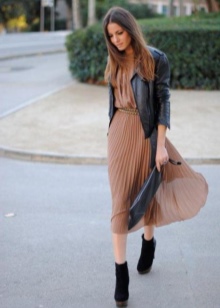 Unter Röcken und Kleidern sind diejenigen am besten geeignet, die eine Mini-Länge oder eine Midi-Länge haben, jedoch nur bis zur Mitte des Oberschenkels. Knielange Produkte sehen mit Stiefeletten am unharmonischsten aus und sorgen für ein falsches Verhältnis der Proportionen.