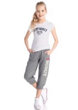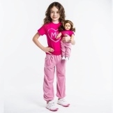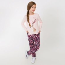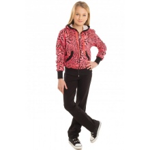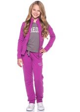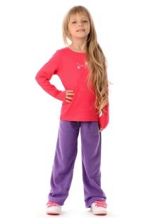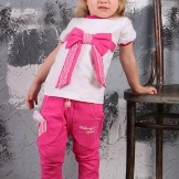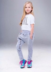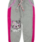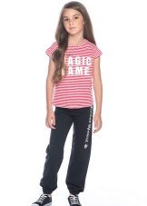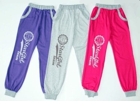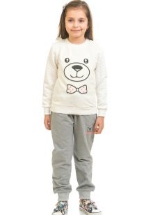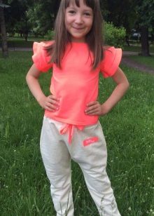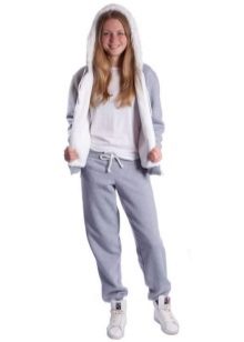 Mädchen neigen zu Veloursoptionen: Sie fühlen sich gut am Körper an und werden in der Regel in mädchenhaften Farben mit Drucken hergestellt. Es erscheinen modische Details: zum Beispiel Baggy im Gesäß.