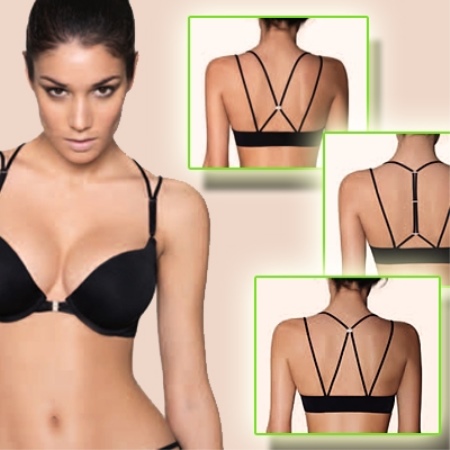 Dies ist ein BH, dessen Träger in verschiedenen Versionen befestigt werden können: traditionell, quer, Schlaufe. Sie können verlängert, breiter oder schmaler angeordnet und zu einem Knoten zusammengebunden werden. Ein solches multifunktionales Modell bietet unbegrenzte Möglichkeiten, Kleidung mit unterschiedlichen Offenheitsgraden zu verwenden: T-Shirts, Kleider mit nackten Schultern oder mit offenem Rücken.