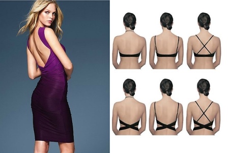 Ein verwandelnder BH ist unverzichtbar für T-Shirts, Tops, Sommerkleider, Overalls mit lockigen Schnitten auf dem Rücken, Schmuck in Form von Trägern, Bändern und Trägern über Kreuz. In solchen Fällen kann das Gurtband auch diagonal befestigt, weit voneinander entfernt, verlängert oder über den Hals geworfen werden.