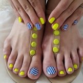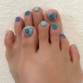 Dank seiner attraktiven verschiedenen Farben können Sie Ihre Beine zu einem echten Kunstwerk machen. Auf den Nägeln sind Muscheln, Meereslebewesen, Geometrie oder andere Muster abgebildet. Die blaue Farbe selbst ist ziemlich gesättigt und wird zweifellos die Aufmerksamkeit auf gepflegte Beine lenken. Sie können erfolgreich Farben kombinieren, Schmuck wählen.