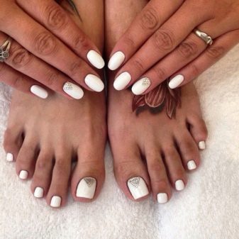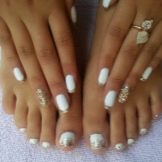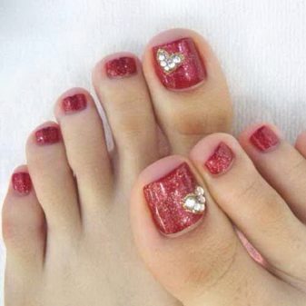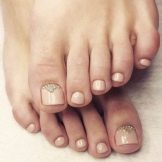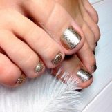Gold- oder Silbertönung hat einen unglaublichen Magnetismus. Beide Farben können mit Strasssteinen, Perlen, Bändern und volumetrischen Dekorationen verziert werden - Sie können sogar verschiedene Arten von Pediküre kombinieren. Der Spiegeleffekt wird durch Reiben erhalten. Solche Beine sehen stilvoll, attraktiv und luxuriös aus. In diesem Fall kann die Pediküre harmonisch mit der Maniküre in Resonanz treten, wenn Sie ähnliche Tonalitäts- oder Dekorationselemente verwenden.