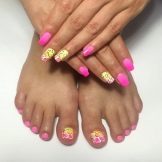Diese Farbe ist die Wahl der positiven Menschen. Selbst wenn die Stimmung verdorben ist, lohnt es sich, eine Pediküre mit diesem Farbton durchzuführen, und Sie können sehen, wie alles um Sie herum rosiger wird. Helle Tonalität ist in dieser Saison relevant. Die Hauptsache sind gepflegte Finger, denn die helle Farbe zieht die Aufmerksamkeit auf sich. Sie können eine feste Gelpolitur verwenden und eine modische Beschichtung herstellen oder verschiedene Farbtöne kombinieren, um ein kreatives Design hinzuzufügen.