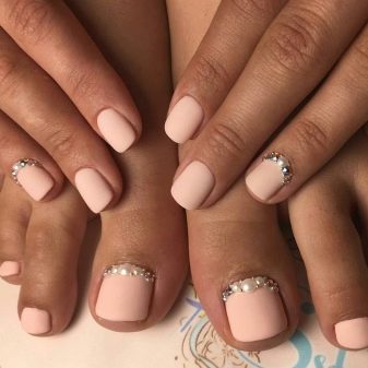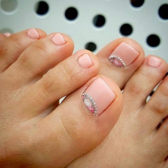 Diese Option sieht immer luxuriös aus. Sie können eine einfache Beschichtung auf den Nägeln hinterlassen oder sie mit einem stilvollen Design dekorieren. Interessant in dieser Saison sind Kombinationen von leichter Maniküre mit Schmuck auf den Daumen, zum Beispiel ein paar Strasssteine oder eine Streuung von Glitzern. Es lohnt sich, die richtigen Schuhe zu finden, um eine gepflegte modische Pediküre hervorzuheben.