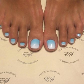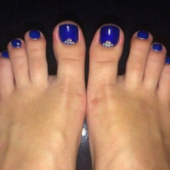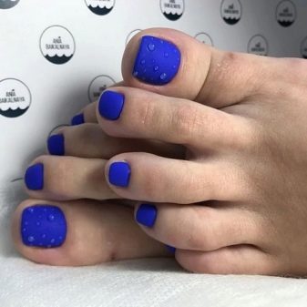 Für viele ist diese Tonalität mit marinen Themen verbunden. Oft verwenden Frauen Pediküre in Blau und Blau, wenn sie in den Urlaub oder auf See fahren. Diese Farbe sorgt für eine erfolgreiche Reise.