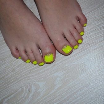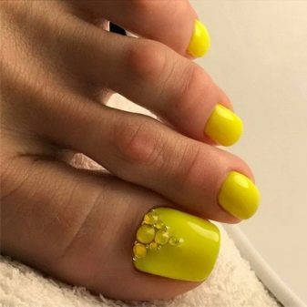 Die beliebte Farbe dieser Saison wird von vielen Damen bevorzugt. An sich wird eine helle Tonalität selbst in einer monophonen Version zu einem Schmuckstück der Beine. Sie können einen Kontrastlack für das Dekor wählen und mit einem dünnen Pinsel niedliche Blumen oder komplizierte Muster herstellen. Das Verteilen von Strasssteinen ist eine beliebte Option - auf diese Weise können Sie Ihre Nägel effektiv und unauffällig dekorieren.