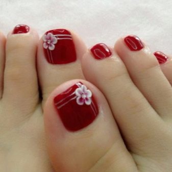 Diese Farbe hat einen besonderen Reiz. Trotz seiner dunklen Tonalität wird eine solche Pediküre elegant aussehen. Es ist ratsam, geometrische Muster hinzuzufügen und Kontraste zu spielen. Solche Optionen passen sowohl zum Feiern als auch ins Büro.Sie können ein Loch in den Daumen kleiner Kristalle machen oder den Raum der Nagelplatte mit Kamifubuki-Steinen füllen.