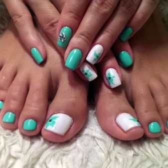 Diese Tonalität steht an der Spitze der Popularität. Sie können eine Grundfarbe auftragen, die eine gute Grundlage für Kreativität darstellt. Es lohnt sich, Ihren einzigartigen Stil zu betonen, indem Sie einen zarten Minzton wählen. Sie können ein wenig Glanz verwenden, um Aufmerksamkeit zu erregen. Vergessen Sie nicht die Auswahl der Farbe der Pediküre für Schuhe, Kleidung und deren Elemente - dies schafft einen harmonischen Bogen.