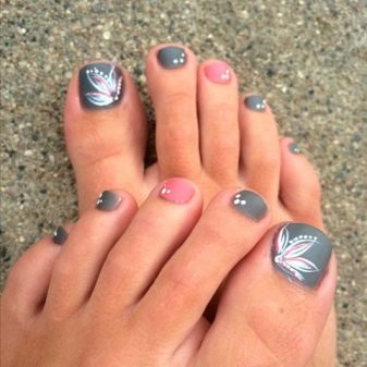 Viele Damen finden diese Farbe uninteressant und langweilig. Dies ist jedoch nicht der Fall, da die grauen Tasten wie nie zuvor relevant sind. Sie eignen sich für jedes Outfit und Schuhe und sind eine hervorragende Basis für die Kreation der kreativsten Meisterwerke. Zum Beispiel können Sie ein stilvolles Muster auf Ihren Daumen zeichnen, es mit einem Schimmer oder Kamifubuki dekorieren. Eine solche Pediküre wird stilvoll und modisch aussehen.