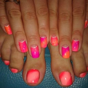 Diese Optionen sind perfekt für jede Kleidung: Sie können eine Vielzahl von Farben kombinieren und Ihren Stil betonen. Interessanterweise ist das Ombre auch zu Hause ganz einfach auszuführen - Sie müssen nur ein wenig üben. Übergänge können vertikal, horizontal und diagonal erfolgen. Die Hauptsache ist die Qualitätsleistung. Sie können Bilder und Dekorelemente hinzufügen, um die Zehen hervorzuheben.