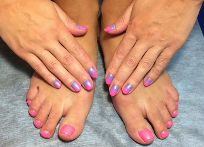 Gradientenpediküre ist ein sanfter Farbübergang auf der Nagelplatte. Diese Option nimmt auch eine führende Position an Armen und Beinen ein. Es ist wichtig, reibungslose Übergänge von Schlüsseln zu erstellen. Zu den Vorteilen dieser Technik gehört die Tatsache, dass sie auf Nägeln verschiedener Formen gut aussieht. Mädchen und reife Frauen können es sich leisten, mit ihren Lieblingsfarben eine Gradientenmaniküre durchzuführen. Es wird originell und modisch aussehen.