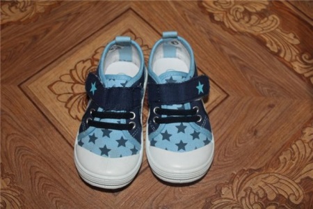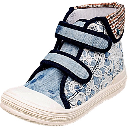 - blaue Turnschuhe mit weißen Schnürsenkeln und Locken in der Nähe der Zunge, verziert mit hellblauer Spitze;