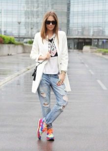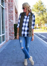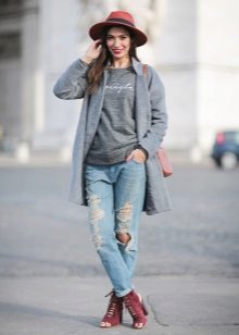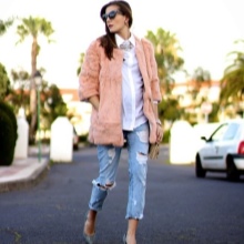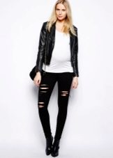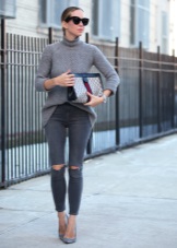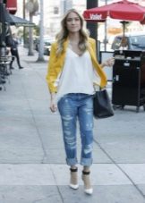 Wenn Sie zerrissene Modelle mit anderen Kleidungsstücken kombinieren, sollten Sie nicht vergessen, dass das Oberteil umso ruhiger und glatter sein sollte, je mehr Löcher und Schlitze in Jeans vorhanden sind.