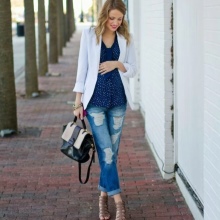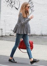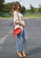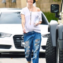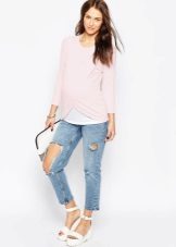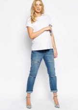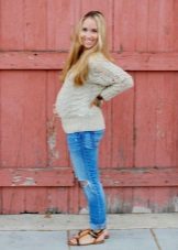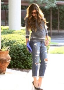 Das beliebte Modell des "männlichen" Schnitts mit zerrissenen Löchern oder Schlitzen wird sehr stilvoll mit Turnschuhen, Ballettschuhen und flachen Sandalen kombiniert. Gerade geschnittene, tief geschnittene Jeans eignen sich hervorragend für werdende Mütter.