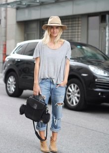 Zerrissene Jeans sehen in der warmen Jahreszeit natürlich am besten und am besten geeignet aus. Sie passen gut zu T-Shirts, losen Blusen oder Tuniken, geraden Hemden und glatten Oberteilen.