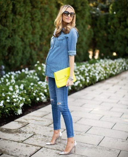 Jeans für werdende Mütter werden mit einem elastischen breiten Gürtel ergänzt, sodass Sie sie in jedem Stadium der Schwangerschaft tragen können, aber Sie sollten sich nicht mitreißen lassen.