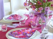 Wenn die Tischdecke und das Geschirr die Hauptfarben sind, fällt die Rolle der Akzente auf Servietten. Ihre Verwendung ist für die grundlegende Aufrechterhaltung der Hygiene notwendig. Auch Besteck ist in sie eingewickelt. Weiß wird ein Klassiker für sie sein, aber je nach Art der Feier kann die Farbe von Gerichten und Tischdecken gewählt werden und andere. Servietten mit einem Muster nicht ausschließen.