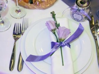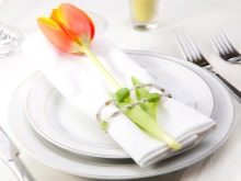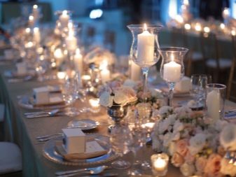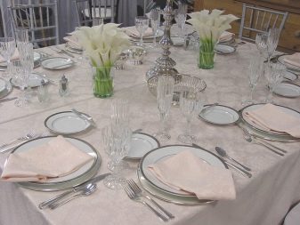 Um eine Feier in einem formellen Rahmen durchzuführen, ist eine strikte Blütenkonsistenz erforderlich. Die Tischdecke wird in schlichter, weißer oder pastellfarbener Farbe verwendet. Alle Geschirrsets sollten für jeden Gast gleich sein, Servietten - traditionell weiß und ohne Muster. Dekorelemente fehlen oder sind minimal.