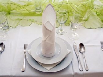 Servietten können auf verschiedene Arten angeordnet werden. Sie können Originalität hinzufügen, indem Sie die abgebildeten Servietten falten. Sie können direkt neben jedem Gast oder auf einem Servierteller platziert werden. Zusätzliche Servietten werden jedoch am bequemsten in speziellen Haltern auf dem Tisch angezeigt, die so angeordnet sind, dass sie für alle am Tisch sitzenden Personen zugänglich sind.
