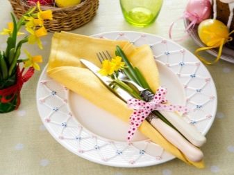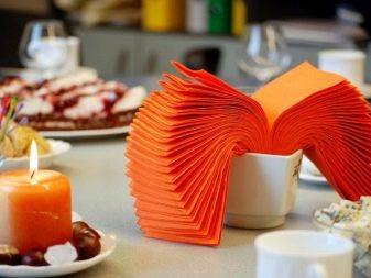 Es ist wichtig, dass sich das Farbschema des Bildes mit ihnen überschneidet. Servietten können auf originelle Weise auf den Tisch gelegt werden, um ein bestimmtes Bild zu erhalten, das in den Stil des Festes passt.