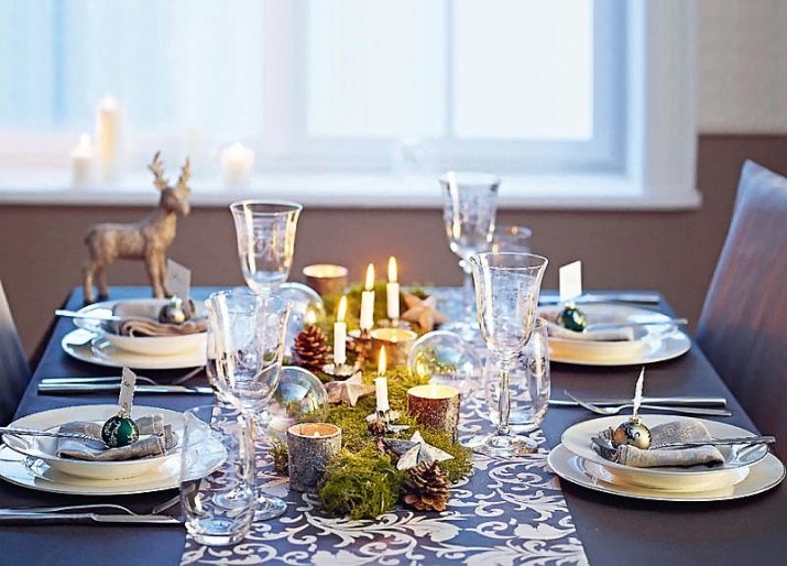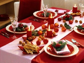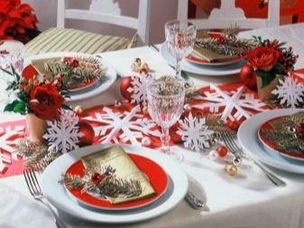 Sie können einen großen Blumenstrauß sowohl in der Mitte des Tisches anordnen als auch gleichmäßig über den gesamten Bereich oder gegenüber jedem der Gäste platzieren. Direkt kann die Oberfläche des Tisches mit Kegeln dekoriert werden, die mit einem künstlichen Silberglanz bestreut werden können, der Schnee simuliert. Die gesättigte Farbe von Servietten, zum Beispiel Rot oder Grün, verleiht dem Neujahrs-Interieur noch mehr positive Noten, insbesondere wenn Sie sie vor dem Servieren in Besteck einwickeln und mit einem kleinen Fichtenzweig dekorieren.