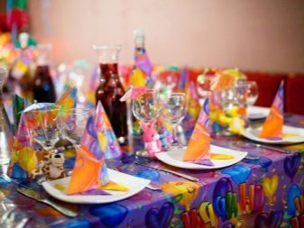 Der Triumph dieser Art ist der demokratischste in Bezug auf die Farben der Servierdetails. P.Selbst wenn Teller und Gläser unterschiedlich sein können, ist das gleiche Muster überhaupt nicht erforderlich. Um den Tisch zu dekorieren, können Sie bunte Luftballons verwenden, eine helle Tischdecke mit Bildern der Helden Ihrer Lieblingskinder-Cartoons.