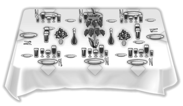 Trinkbehälter befinden sich im freien Raum zwischen den Tellerreihen. Säfte und Wasser werden in großen Dekantern, Spirituosen in kleineren Dekantern und Wein direkt in Flaschen serviert. Wenn Wein auf dem Tisch liegt, müssen Sie einen Korkenzieher platzieren.