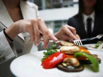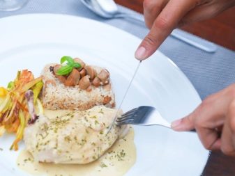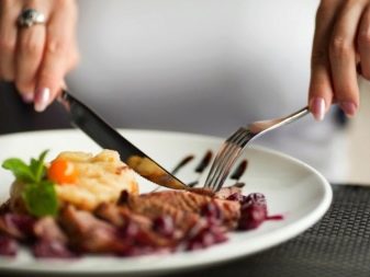 - Wenn Sie ein Fleischgericht mit einer Beilage essen, ist es durchaus möglich, dass die Gabel einen Esslöffel ersetzen kann. Zum Beispiel, wenn Kartoffelpüree oder Reis als Beilage serviert wurden. Es ist zu beachten, dass die Zähne nach oben schauen sollten, um die Beilage richtig auf die Gabel zu nehmen. Kleine Partikel der Schale, Kartoffelpüree und andere Beilagen, verschiedene Salate sollten mit Schaufelbewegungen von sich genommen werden.