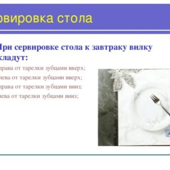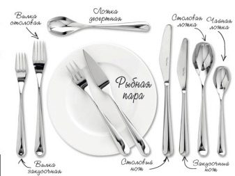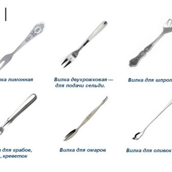 - Fisch - diese Gabel mit vier Zinken. Die Form kann jedoch sehr unterschiedlich sein: abgerundete Kanten, eine Rille zwischen den Zähnen usw. Die Form dieses Bestecks hängt direkt davon ab, welcher Fisch auf dem Tisch serviert wird. Dieses Gerät sollte sich links von der Tischgabel befinden.