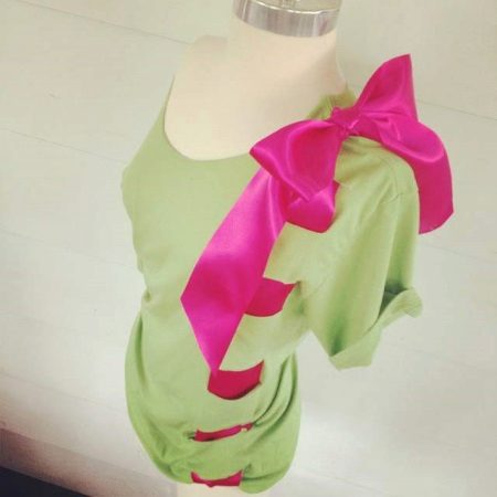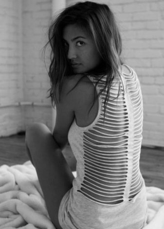 - Seite (Sie können eine großartige Option mit einem genähten Stoff mit horizontalen Schnitten aus demselben T-Shirt oder derselben genähten Spitze wählen).
