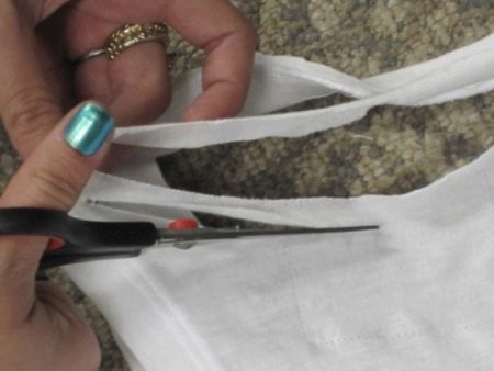 - im Kragenbereich (halbkreisförmige Schnitte sind geeignet), während das Gummiband abgeschnitten werden kann;